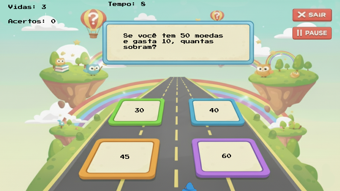 Um jogo educativo para crianças de 7 a 9 anos que ensina matemática básica (adição, subtração e multiplicação simples) por meio de desafios em um mundo colorido. O objetivo é aprender brincando, com fases curtas e feedback positivo quando o aluno acerta.
